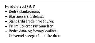 I Danmark har vi nu »levet« med GCP-reglerne i mere end ti år. Der er i denne periode ofte blevet spurgt, om GCP har bedret patientbehandlingen. Det er svært at svare på, men der er ingen tvivl om, at den bedre planlægning af GCP-forsøgene har gjort den kliniske forskning mere målrettet, idet man fra begyndelsen af forsøget præcist har defineret, hvilke parametre, der skal undersøges og hvordan. Alt andet lige vil dette kræve færre forsøgspersoner. Ligeledes er der ingen tvivl om, at implementering af GCP har øget datakva-liteten og muligheden for verifikation af data. GCP vil føre til data, som er mere acceptable både til publikation og som dokumentation over for myndighederne af en ny behand-ling (8).