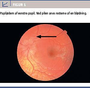 En fire år gammel, normalvægtig dreng blev indlagt med hovedpine, opkastninger, fotofobi og træthed gennem seks dage. Symptomerne var værst om morgenen. Han havde normalt bevidsthedsniveau, og resultaterne af den neurologiske undersøgelse var normale. Ved en øjenundersøgelse blev der påvist normalt visus på 1,0 på begge øjne uden korrektion, inkomplet venstresidig abducensparese, i øvrigt frie øjenbevægelser, ingen ptose og normale pupiller. En oftalmoskopi viste kronisk papilødem på begge sider med en antydet blødning på den venstre side (Figur 1). Drengen kunne ikke kooperere til synsfeltundersøgelse.