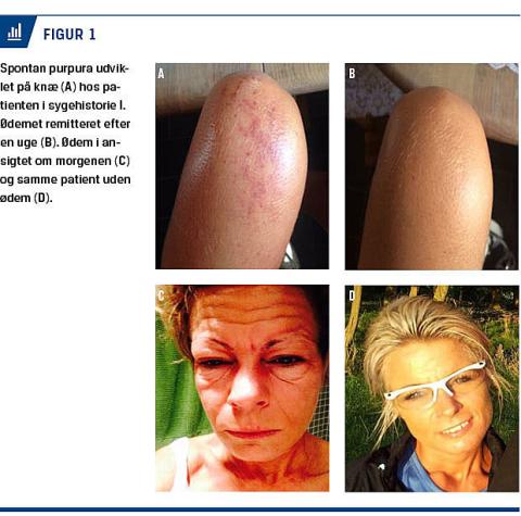 I. En 40-årig kvinde blev henvist fra en praktiserende dermatolog på mistanke om hereditært angioødem. Hendes symptomer begyndte efter en ferierejse til Tunesien, hvor hun fik influenzalignende symptomer med træthed og generel ødemtendens. Efter to måneder havde hun mere eller mindre konstant væskeansamling i huden med forværring efter fysisk aktivitet og stående stilling. Hun beskrev ledsagende muskelsmerter, træthed, svimmelhed, tørst og pollakisuri med mere end 35 vandladninger i døgnet. Hun havde tendens til urticaria og eksem og kunne ved svære væskeansamlinger