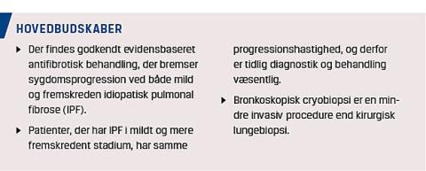 Der er inden for de seneste år kommet evidensbaseret antifibrotisk behandling, som nedsætter progressionen af IPF og forlænger overlevelsen, hvorfor rettidig diagnose og behandling er blevet vigtigere end nogensinde [6, 7]. I det følgende vil vi gennemgå risikofaktorer for og symptomer på IPF, nye diagnostiske tiltag, herunder transbronkial kryobioptering (cTBB), samt evidensen for tidlig behandling.