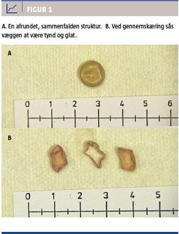 Man modtog en afrundet og sammenfalden proces i formalin, den var 12 mm i diameter og kunne ikke umiddelbart diagnosticeres, men man havde mistanke om, at det var en parasit eller lignende. Ved makroskopisk udskæring sås processen at være ganske tyndvægget og hul (Figur 1). Selve væggen var sej og ikke elastisk, og det drejede sig ikke om biologisk materiale. Man forsøgte at indstøbe processen til mikroskopi, men præparatet kunne ikke hænge fast på mikroskopiglasset, hvilket understøttede, at det ikke indeholdt biologisk materiale, som er nødvendigt, for at det tynde snit af paraffinindstøbt væv kan fæstnes til et mikroskopiglas.