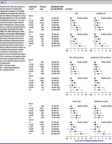 Studiet inkluderede 13.956 individer (6.375 mænd, 7.581 kvinder) i alderen 20 til 93 år med op til 31-års opfølgning. Af disse udviklede 1.529 (779 mænd, 750 kvinder) iskæmisk apopleksi. Mænd med forhøjede niveauer af ikkefastende triglycerider havde alderskorrigerede HR for iskæmisk apopleksi i området fra 1,4 (95%-KI; 0,9-2,1) for triglycerider på 1-1,99 mmol/l til 3,2 (95%-KI; 1,7-6,2) for niveauer på ≥ 5 mmol/l versus mænd med ikkefastende triglycerider på < 1 mmol/l (p < 0,001 for trend) (Figur 1 ). De tilsvarende værdier for kvinder lå i området fra 1,3 (95% KI; 1,0-1,8) for triglyceridniveauer på 1-1,99 mmol/l til 5,1 (95% KI; 1,7-14,8) for niveauer på ≥ 5 mmol/l versus kvinder med ikkefastende triglycerider < 1 mmol/l (p < 0,001 for trend). Efter multifaktoriel korrektion lå tilsvarende HR i området fra 1,3 (0,8-1,9) til 2,5 (1,3-4,8) for mænd (p < 0,001 for trend) og 1,3 (0,9-1,7) til 3,8 (1,3-11,1) hos kvinder (p < 0,001 for trend). Yderligere korrektion for body mass index (BMI) og diabetes mellitus mindskede risikoestimaterne i både alders- og multifaktorielt korrigerede modeller (Figur 1). Yderligere korrektion for HDL-kolesterol-niveauer mindskede ligeledes risikoestim ater i både alders- og multifaktorielt korrigerede modeller. Niveauerne af ikkefastende triglycerider var dog stadigvæk associeret til risikoen for iskæmisk apopleksi (Figur 1).