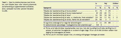 Materiale og metoder: De kontaktede klinikker blev fundet ved internetsøgninger, annoncer i aviser, telefonbogens De Gule Sider og ved nummeroplysningen. Målgruppen var klinikker på Sjælland, som udførte laser- eller IPL-behandling af pigmenterede læsioner, pigmenterede nævi, solskadet hud, akne og/eller uønsket hårvækst. Speciallægeklinikker inden for dermatologi og plastikkirurgi blev ekskluderet. Ved anonyme telefonopringninger præsenteredes klinikkerne for standardiserede spørgsmål under angivelse af, at spørgeren var en potentiel klient.