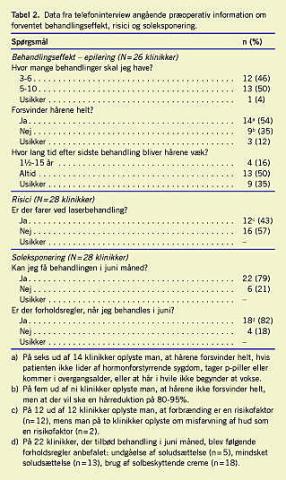 På spørgsmål om den præoperative information om laser- og fotoepilering oplystes det anbefalede antal behandlinger at variere fra tre til ti. Behandlingseffekten blev i 54% af klinikkerne angivet at være et totalt svind af hår, og 50% af klinikkerne angav, at hårvæksten ville forsvinde for altid (Tabel 2). På spørgsmål om potentielle risici oplyste 57% af klinikkerne, at der ingen farer var forbundet med behandlingerne, mens 43% af klinikkerne oplyste, at den væsentligste risiko er forbrændinger. Her angav 25%, at der ingen farer var, hvis patienten fulgte klinikkens anbefalede forholdsregler. Laserbehandling blev tilbudt på størstedelen af klinikkerne (79%) i juni måned, og 18% angav, at det ikke var nødvendigt at træffe specielle forholdsregler ved behandling i solrige perioder (Tabel 2). De resterende klinikker (21%), som ikke tilbød laserbehandling i juni måned, oplyste, at årsagen til dette var den øgede udsættelse for sol i sommermånederne.