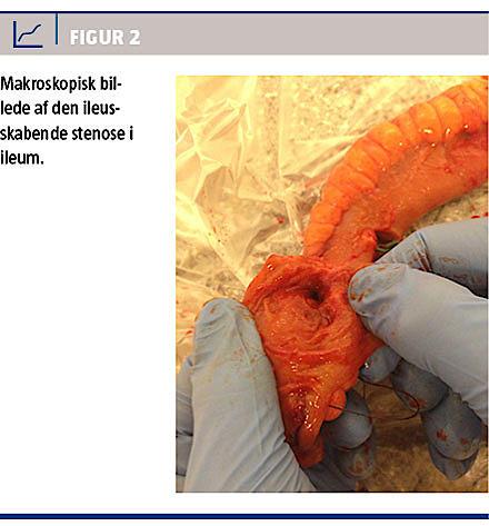 Oftest er en mekanisk ileustilstand forudgået af tidligere intraabdominal kirurgi med streng- eller adhærensdannelse til følge. I denne specifikke sygehistorie gjorde man peroperativt et atypisk fund i form af et tyndtarmssegment med hele tre stenoser, hvoraf ét var ileusskabende (Figur 2). Mekanisk tyndtarmsileus pga. PTLD hos voksne er tidligere kun sporadisk beskrevet [1], og vi kender ikke til andre beskrevne tilfælde i Danmark. Histologisk set dækker PTLD over et heterogent billede, der bredt karakteriseres ved en abnorm lymfoid celleproliferation, oftest en B-celle-proliferation, hvor variationen spænder fra benign hyperplasi til højmalignt lymfom. To af de største risikofaktorer for udviklingen af PTLD er immunsupprimering og infektion med Epstein-Barr-virus [2]. Hos patienten i sygehistorien afslørede den histologiske undersøgelse af de stenoserede tyndtarmspartier lymfoidt væv foreneligt med B-celle-lymfom samt positiv testning af vævet for Epstein-Barr-virus. Dette gjorde det samlede billede foreneligt med diagnosen PTLD. Forekomsten af PTLD varierer hos organtransplanterede patienter, afhængigt af hvilket organ der er transplanteret, og hvilken immunsupprimerende behandling der gives. Overordnet er incidensen 1-3% [1, 3]. Det er kendt, at PTLD hyppigt manifesterer sig gastrointestinalt. Det kliniske billede ved gastrointestinal PTLD er uspecifikt og spænder bredt. Patienterne kan have lette mavesmerter, obstipation, blodige diaréer eller akut abdomen [4]. I sygehistorien beskrives udviklingen af en ileustilstand, der krævede akut kirurgisk behandling. Perforation af tarmvæggen eller større intraabdominale blødninger er andre potentielt livstruende tilstande, der kan give anledning til kirurgisk intervention som følge af PTLD [4]. I litteraturen er der kun beskrevet enkelte tilfælde, hvor PTLD har medført operationskrævende ileus hos voksne [1]. Denne sygehistorie er således et eksempel på, hvordan en sjælden manifestation af PTLD kan ligge til grund for en almindelig tilstand som mekanisk tyndtarmsileus hos en tidligere intraabdominalt opereret patient. Den almene kirurg bør således – på trods af at den akutte behandling af en manifest ileustilstand naturligvis er den samme – have kendskab til denne diagnose hos tidligere transplanterede patienter. Derudover bør ileus eller enhver anden alvorlig gastrointestinal præsentationsform af PTLD give anledning til revurdering af den immunsupprimerende behandling på en hæmatologisk afdeling.
