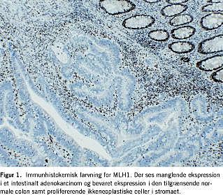 Defekt DNA-mismatch repair (mmr) kan påvises i omkring 15% af alle kolorektale cancere [1]. Dette kan skyldes mutationer i gener, som koder for mmr-proteiner, eller blokeret transkription af disse. Defekter kan påvises ved DNA-undersøgelse for mikrosatellitinstabilitet (MSI) eller ved immunhistokemisk farvning for mmr-proteiner. Det er karakteristisk, at karcinomerne fra patienter med hereditær non-polypøs kolorektal cancer (HNPCC) har mutation i et af DNA-mmr-proteingenerne. Disse tumorer har en bedre prognose end de øvrige [2], men betydningen mht. effekt af 5-fluorouracil (5-FU)-baseret kemoterapi er endnu uafklaret [3, 4]. Formålet med at udføre immunhistokemisk farvning for mmr-proteiner er at finde frem til mulige HNPCC-patienter. Der findes kommercielt tilgængelige antistoffer, der er rettet mod mmr-proteinerne MLH1, MSH2, MSH6 og PMS2. Ca. 90% af de mmr-defekte tumorer udviser manglende immunhistokemisk ekspression af MLH1 eller MSH2. Manglende ekspression af MLH1 ledsages som regel af manglende ekspression af PMS2. Dette hænger sammen med, at PMS2 normalt stabiliseres ved kompleksbinding til MLH1. Tilsvarende ledsages manglende ekspression af MSH2 ofte af manglende ekspression af MSH6. Isolerede negative farvninger for PMS2 eller MSH6 kan skyldes primær inaktivering af disse. En anden mulighed er muteret inaktivt MLH1- hhv. MSH2-protein med bevaret immunhistokemisk reaktivitet [5]. I den seneste udgave af retningslinjer for diagnostik og behandling af kolorektal cancer anbefales det, at der udføres immunhistokemiske farvninger for mmr-proteiner på alle tumorer [6]. Det er den negative reaktion, som her giver det diagnostiske udsagn, at der er tale om en tumor med defekt mmr. For at undgå fejltolkning af en eventuel negativ reaktion er det vigtigt at sørge for, at der bliver farvet på et snit med indbygget positiv kontrol. Positiv kontrol kan f.eks. være tilgrænsende normal colonslimhinde (Figur 1). Hvis et sådan snit ikke er til rådighed kan prolifererende stromale celler eller tumorinfiltrerende lymfocytter ofte anvendes i stedet. Indimellem ses en lidt heterogen farvereaktion med intensitetsvariation eller vekslende positive og negative tumorceller. Det er fristende at opfatte dette som udtryk for en nedsat ekspression af mmr-proteiner. I et nyligt publiceret arbejde om tumorer fra patienter, der var under mistanke for at have HNPCC, blev der påvist defekt mmr ved mikrosatellitundersøgelse i en række tilfælde med immunhistokemisk heterogen reaktion [7]. Imidlertid var der også heterogen reaktion i tumorer med intakt mmr. Man kunne forestille sig, at den heterogene reaktion afspejler uensartet proliferation, eller at ukendte præparationstekniske faktorer spiller en rolle. Der er ikke entydige data, som understøtter, at en nedsat immunhistokemisk ekspression af mmr-proteiner indebærer en øge t sandsynlighed for, at MSI-H er til stede, i forhold til tumorer med normal ekspression. På nordisk plan er der lavet en sammenligning mellem kvaliteten af immunfarvninger for MLH1 og MSH2 udført på hhv. 25 og 26 patologiafdelinger. Resultatet heraf er offentliggjort på Nordiqcs hjemmeside [8].