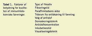 Immunhistokemi er en histologisk metode, hvor man ved hjælp af specifik antistofbinding er i stand til at påvise lokalisationen af bestemte proteinstrukturer i vævssnit. Metoden udføres rutinemæssigt på alle landets patologiafdelinger. I lysmikroskopet viser en positiv reaktion sig typisk ved en brunlig farve på det sted, hvor den specifikke antistofbinding finder sted (Figur 1 ). Selv om princippet i metoden er enkelt, er der en lang række faktorer, som har indflydelse på det endelige resultat (Tabel 1 ). I takt med, at der opnås stigende indsigt i molekylærbiologiske faktorer vedrørende kolorektal cancer, øges også muligheden for praktisk anvendelse af immunhistokemi med henblik på fastlæggelse af kontrol- og behandlingsrelevante tumorkarakteristika. I det følgende beskrives nogle anvendelsesmuligheder for immunhistokemi i forbindelse med kolorektal cancer.