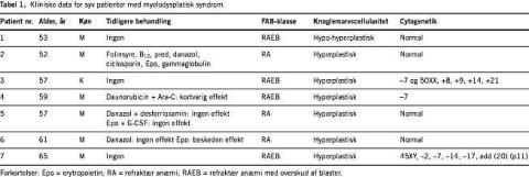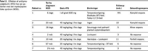 I perioden fra juli 2000 til oktober 2001 fik syv MDS-patienter behandling med ATG og ciclosporin. ATG-dosis var enten 20 mg/kg/dag i tre dage eller 40 mg/kg/dag i fire dage i.v. Ciclosporin 5 mg/kg blev givet per os fra dag 5 og herefter vejledt af serumciclosporin- og serumkreatininværdier. Desuden fik patienterne prednisolon 1 mg/kg i ti dage mod bivirkninger, og forebyggende over for infektioner fluconazol 50 mg dagl. i gennemsnitlig 115 dage, aciclovir 800 mg dagl. i gennemsnitlig 115 dage og sulfamethoxazol og trimethoprim 800/160 mg 2 × dagl. × 3/uge i gennemsnitlig 258 dage. Tre af patienterne (nr. 1, 5 og 6) fik behandlingen som led i en skandinavisk multicenterundersøgelse.