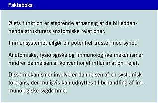 Summary The immune system and the eye Ugeskr Læger 2008;170(38):2953-2957 The special relationship between the eye and the immune system rests on a number of anatomical, physiological and immunological mechanisms. These mechanisms prevent the delicate structures of the eye from potentially damaging immunogenic inflammation while protecting against pathogens. Rather than inflammation, antigen induces a form of systemic and antigen-specific immunological tolerance. Owing to its systemic nature, this tolerance may be utilised to achieve successful treatment of immunological disorders.