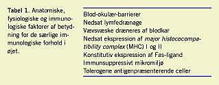Forståelsen af immunprivilegiet er stadig ikke komplet. Særligt hvad angår forholdene i øjet, har man dog gennem de seneste ca. 30 år på baggrund af funktionelle dyremodeller på især mus kunnet karakterisere en hel række ansvarlige passive og aktive faktorer, der tilhører både det innate og adaptive immunsystem (Tabel 1 ). Ud over de rent fysiske forhold findes der i det indre øje således et væld af cellebundne og opløselige immunregulerende faktorer, hvis samtidige tilstedeværelse skaber et immunregulerende mikromiljø, der på den ene side beskytter øjets anatomi mod ødelæggende inflammation og på den anden side beskytter mod infektion [3]. Man mener, at de samme forhold gælder i det humane system.