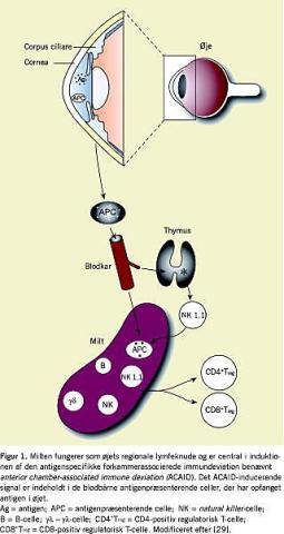 Hvis antigen optræder i forkammeret, udløser det en lang række begivenheder, der munder ud i et systemisk, men afvigende immunsvar (Figur 1 ). Da de oprindelige studier i mus knyttede sig til antigen placeret i forkammeret, er fænomenet benævnt anterior chamber-associated immune deviation (ACAID) [27]. En subtype af antigenpræsenterende celler (APC) er centrale for induktionen af ACAID. Disse celler findes bl.a. i iris og corpus ciliaris, hvor de er i nær kontakt med den immunregulerende kammervæske [28]. Kammervæskens indhold af særligt TGF-β har afgørende indflydelse på APC [29]. Men også forekomsten af FasL og komplement-proteinet C3 er en forudsætning for, at APC kan inducere ACAID [20, 30].