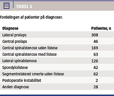 Fordelingen af patienter på diagnoser kan ses i Tabel 1. Der er registreret 337 diskusprolapsoperationer, 255 dekompressionsoperationer, 119 instrumenterede deseoperationerr, 101 uinstrumenterede deseoperationer, 11 diskusproteseoperationer og 22 andre indgreb.