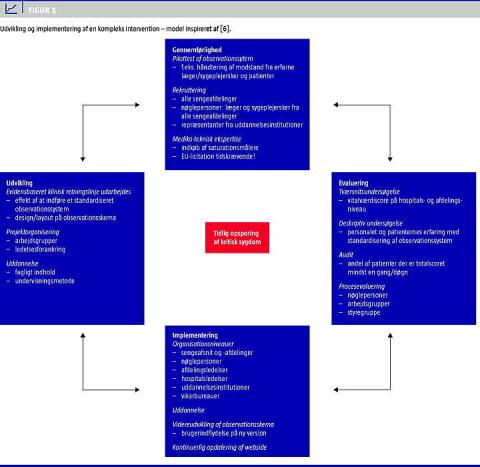 Summary The complexity of the implementation of an observation and tracking chart for critical illness Ugeskr Læger 2011;173(40):2487-2490 Critically ill patients on wards are identified too late. At Aarhus University Hospital, Aarhus Sygehus, staff did not act appropriate to unacceptable values. The solution presented is development and implementation of a Track and Trigger System: a standardised observation chart encompassing frequency of vital signs measurement combined with a decision algorithm based on scores dictating skill level of decision-making. Educational programmes and specialist function for ward staff as well as action cards containing identification, situation, background, analysis, and advice and an airway, breathing, circulation, disability and environment approach to support clinical decision-making are introduced.