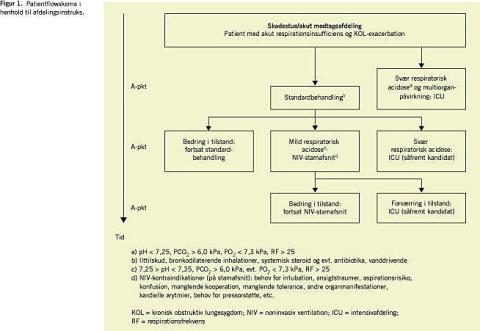 Når patienterne blev modtaget initialt, blev der efter de indledende undersøgelser givet standardbehandling med bronkodilaterende inhalationer på forstøver, systemisk ste-roidbehandling og antibiotika, hvis det blev skønnet indiceret. Røntgenundersøgelse af thorax blev gennemført rutinemæssigt ved indlæggelsen. Ca. en halv time til en time efter den indledende behandling blev det ved fornyet arterieblodgasanalyse vurderet, om der var indikation for NIV-behandling. Opfølgning af patienterne i det primære forløb var skematiseret, og en halv time efter iværksat behandling blev arterieblodgasanalyse gentaget for at evaluere, om behandlingen virkede, og om der var behov for justering af inspiratorisk eller/og ekspiratorisk trykstøtte (Figur 1 ). Behandlingssvigt blev defineret som overflytning til ICU eller død.