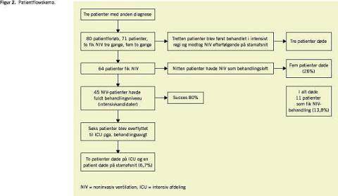Af de resterende 45 patienter blev 36 (80%) behandlet med NIV med god effekt, seks blev overflyttet til intensivt regi med henblik på tættere monitorering med NIV eller intubation (to patienter). Af disse døde to patienter på ICU, og en døde uventet umiddelbart forud for planlagte udskrivelse (Figur 2 ).