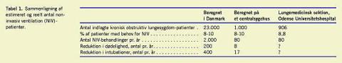 Plant et al [2] har i en randomiseret multicenterundersøgelse påvist, at selekterede patienter med KOL i eksacerbation havde nedsat dødelighed og nedsat risiko for at få behov for intubation, når de blev behandlet med noninvasiv ventilation (NIV) i tillæg til standardbehandlingen på et lungemedicinsk sengeafsnit eller et intermediær afsnit. Inklusionskriterierne til behandling var mild acidose (pH 7,25-7,35) og hyperkapni (PCO2> 6,0). Omkostningseffektberegninger [5] har ligeledes vist, at nedsatte udgifter til intensivafsnit (ICU) gør NIV-behandling til et fordelagtigt behandlingstilbud.