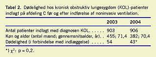 Vi præsenterer derfor her udelukkende patientforløb, og sammenligning af antal patienter i 2003 og 2004 er gjort for at sikre, at antallet af indlagte patienter ikke har ændret sig væsentligt i perioderne. Der var flere registrerede patientforløb i ICU i 2004 end i 2003, om end der er registreret færre døde. En forklaring kan være, at behandlingsniveauet for KOL-patienter har flyttet sig til mere aktiv behandling, men tallene er for små til, at man kan konkludere noget på baggrund af dem. Yderligere undersøgelser er nødvendige for at klarlægge dette.