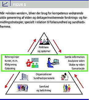 De klimatiske sundhedsudfordringer er komplekse, men kan være en konkret anledning til at universiteter og sundhedsorganisationer ændrer form og indhold i uddannelserne, så uddannelsessøgende generelt opøves i aktiv generering af viden og deltagerinvolverende forsknings- og KT-strategier, specielt i relation til folkesundhed og sundhedsfremme, se Figur 1 . Der er efterhånden flere eksempler på, hvorledes dette kan gøres [17-19]. Et af dem er fra Harvard, hvor man tidligt i medicinstudiet sætter disse temaer på skemaet med et basalvidenskabeligt kursus om emnet [17]. Deres kursus indeholder elementer af epidemiologi; lægens rolle i folkesundhed, akutte situationer og i sundhedssystemet generelt; interventionsstrategier; kritiske litteratur-review; og rollespil med influenzapandemi som emne. Et andet eksempel er Dartmouth, som i nogle år har haft et toårs Leadership preventive medicine -kursus, som fører til en master i folkesundhed, og som kombineres med en speciallægeuddannelse [18]. Det interessante er, at de specialer, som dette program kombineres med, spænder meget vidt: anæstesi, almen medicin, intern medicin, kirurgi, patologi, psykiatri, pædiatri og gynækologi. Det sidste eksempel er en forskningsuddannelse vedrørende sundhedsydelser med fokus på samfundsbaserede, brugerinvolverende forskningsprincipper [19]. Dette kører på fire universiteter i USA. Disse programmer er rettet mod oplæring i samarbejde med forskellige aktører i samfundet vedrørende forskning og udvikling af forskellige tiltag. Erfaringen viser, at det er en udfordring at skabe vedholdende samarbejde mellem forskellige institutioner og organisationer. Det skyldes bl.a. organisationernes forskellige kulturer og værdier, rigide rutiner og regler for økonomi- og administrationsforhold, specielt i relation til stillingsstrukturer og karrieremuligheder [20]. Disse organisatoriske siloer synes at være en udfordring generelt for klinisk og translationel forskning samt KT [20], og det problem er nok et af de vigtigste at tage hul på, inden »vinden vender«.