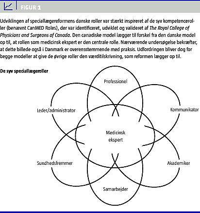 Reformen lægger op til, at de syv roller som lægelige funktionsområder skal være ligeværdige og lige gyldige [1]. Samtidigt finder en differentiering sted på formuleringsplan, idet rollen som medicinsk ekspert inden for samtlige specialer er detaljeret beskrevet, mens de øvrige roller beskrives i mere generelle termer [2]. Disse er ikke nuanceret i relation til f.eks. relationelle, situationelle, sygdomsbestemte eller andre forhold, der indvirker på indholdet i kompetencen. Hvordan rollerne i lyset af tvetydige meldinger slår igennem på praksis, belyses gennem observation af praksis i kombination med informanternes oplevelse af rollerne og deres evaluering i den kliniske praksis. Dette er fokus for artiklen.