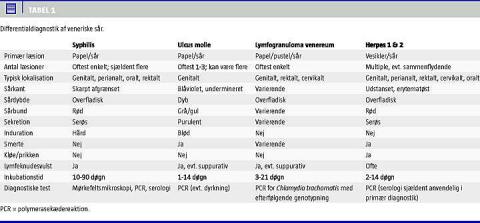 Ud over den lave forekomst vanskeliggøres diagnosen af, at bakterien er svær at dyrke og sjældent overlever transport til laboratoriet. Polymerase-kædereaktions (PCR)-baseret diagnostik har forbedret muligheden for direkte påvisning af bakterien i sårsekret [1]. Vi er aktuelt er i færd med at validere en ny PCR-baseret metode, der med en enkelt podning kan skelne mellem forskellige patogener ved veneriske sår. Metoden forventes at blive tilgængelig på Statens Serum Institut inden for den nærmeste fremtid. Patienter med genitalsår, hvor der er usikkerhed om den kliniske diagnose, bør dog fortsat henvises til venerologisk specialistudredning.