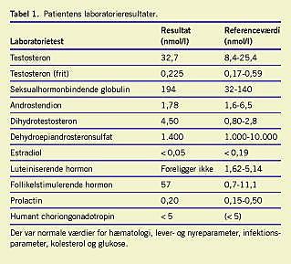 Efter ni måneders behandling fik patienten erektiv impotens. Libido var bevaret, og genitalia externa var upåfaldende, dog var patienten højresidig orkiektomeret for 26 år siden pga. et inkarcereret ingvinalhernie. Hårvæksten var normal, og der var ingen gynækomasti. MTX blev forsøgsvis seponeret, og i løbet af 1-2 uger forsvandt potensproblemerne fuldstændigt. Ved reeksponering en måned senere med 10 mg × 1 ugentligt recidiverede patientens potensproblemer efter ca. to måneder, hvorfor han ønskede at ophøre med MTX, og han påbegyndte behandling med azathioprin. Patientens blodprøvesvar (11/2 år efter påbegyndelse af MTX-behandling) ses i Tabel 1 .