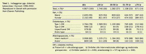 Diabetisk ketoacidose (DKA) er en alvorlig, akut komplikation i forbindelse med diabetes. I tidligere studier har man påvist en stigende incidens af DKA og faldende mortalitet ved DKA. Ved registerudtræk fra Landspatientregistret 1996-2002 og dødsårsagsregistret 1996-2000 blev der fundet 4.807 indlæggelser og 137 dødsfald registreret med en DKA-diagnose. Incidensen i hele befolkningen var 12,9 pr. 100.000 pr. år, og mortaliteten var samlet 4%. Dødsfald med DKA synes at være knyttet til alder >70 år og til akut eller kronisk somatisk komorbiditet oftest i form af en kardiovaskulær lidelse (47%) eller infektion (30%).