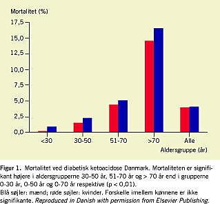 I to danske epidemiologiske studier har man belyst incidens og mortalitet af DKA. Ellemann fandt på baggrund af indlæggelsesdata fra Frederiksborg Amt, at incidensen af DKA (for personer > 15 år) i den generelle befolkning i perioden 1960-1979 steg fra 2,5 til 8,5 pr. 100.000 pr. år [3]. Snorgaard gennemgik alle indlæggelser for patienter med kendt diabetes i Københavns Amt i 1978-1979. Den årlige incidens af DKA blev estimeret til 15 pr. 100.000 i den generelle befolkning og til 4,5 pr. 100 insulinbehandlede diabetikere [4]. Anvendes epidemiologiske data fra Århus Amt [5], er den tilsvarende incidens pr. insulinbehandlet diabetiker 1,7 pr. 100 i vores materiale. Selv om studierne ikke direkte kan sammenlignes, synes incidensen af DKA i den generelle befolkning således at være stort set uændret siden 1980, men den er tilsyneladende mere end halveret blandt insulinbehandlede diabetikere. Dette fald kan overvejende forklares ved en kraftig stigning i prævalensen af insulinbehandlet T2DM [6]. I gruppen < 30 år (der må antages næsten udelukkende at omfatte patienter med type 1-diabetes) observerer man dog også et fald fra 8,3 til 4,4 pr. år pr. 100 diabetikere.