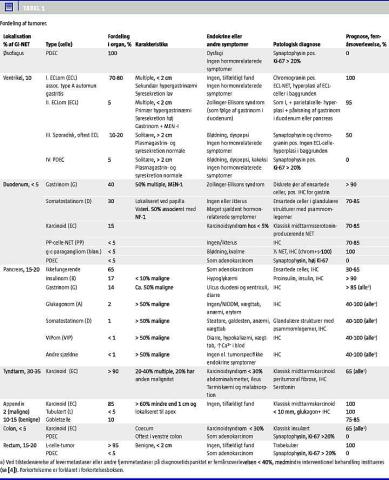Inden for GI-systemet fordeler tumorerne sig som vist i Tabel 1 . Incidensen af de enkelte NET varierer betydeligt i forskellige studier og er derfor anført med stor variation.
