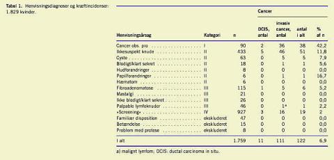 I registreringsperioden blev der henvist 1.829 kvinder til visitation på Brystkirurgisk Klinik (Tabel 1 ). I alt 70 kvinder blev ekskluderet fra undersøgelsen, idet henvisningsårsagerne ikke var relevante for opgørelsen. Det drejede sig om 47 kvinder henvist til udredning for familiære dispositioner for mammacancer, 15 kvinder henvist med betændelse og otte kvinder, der havde problemer med siliconeproteser.