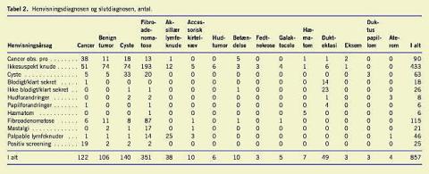 Resultater: Der var i alt 1.829 kvinder, som blev henvist i perioden. Henvisningsdiagnosen var cancer obs. pro hos 90 kvinder. Blandt disse havde 38 kvinder cancer (42,2%). Henvisningsdiagnosen var en ikkemistænkelig knude, blodigt eller klart sekret, forandringer i huden eller på brystvorten hos 534 kvinder. I alt 58 kvinder havde cancer (10,9%). Blandt kvinder henvist med fibro-adenomatose, palpable lymfeknuder eller ikke blodigt sekret var incidensen af cancer syv ud af 208 (3,4%). Ventetidsgarantien for kvinder henvist på grund af mistanke om cancer var opfyldt i 100% af tilfældene. Middelventetid var fem dage.