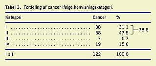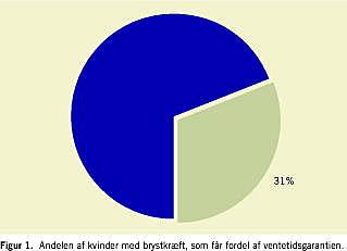 Denne statistik virker umiddelbart tilfredsstillende. Men, når man ser på data fra en anden vinkel er situationen mindre hensigtsmæssig: Kun 31% af kvinderne med kræft fik fordelen af ventetidsgarantien (Figur 1 ). Havde man også inkluderet kategori II i garantien, ville man have »fanget« 78,6% af de relevante kvinder (Tabel 3).