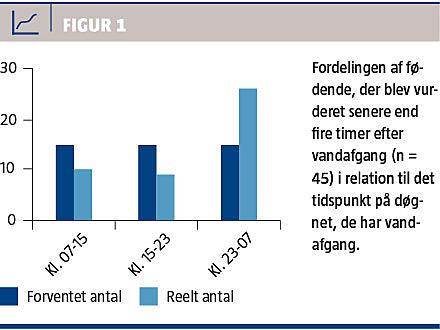 De 45 patienter, der blev vurderet senere end fire timer efter PROM, burde fordele sig jævnt ud over døgnet. Som det fremgår af Figur 1, er der imidlertid en signifikant større andel blandt disse, der havde PROM i tidsrummet kl. 23-07 (p = 0,001).