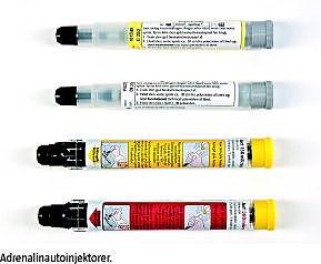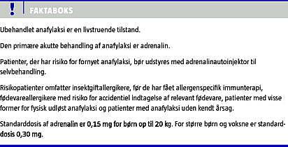 Summary Indication for adrenalin autoinjector after anaphylaxis Ugeskr Læger 2012;174(25):1741-1743 Anaphylaxis is a potentially fatal hypersensitivity reaction, which should be treated with adrenaline. Patients at risk of recurrent anaphylaxis after the initial episode should be prescribed an adrenalin autoinjector. The patients include persons, who are allergic to insect venom, before they reach the maintenance dose of allergen-specific immunotherapy, persons with food allergy who are at risk of accidental intakes, persons with anaphylaxis induced by low-intensity physical activity, and idiopathic anaphylaxis. The recommended dose of adrenaline is 0.15 mg for children up to 20 kg and 0.30 mg for larger children and adults.