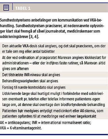 Medicinrelaterede utilsigtede hændelser er almindelige, og alene i 2012 blev der indrapporteret ca. 55.000 tilfælde, men omfanget er forventeligt langt større. VKA er blandt de lægemidler, der hyppigst indgår i utilsigtede hændelser, og der er tidligere beskrevet fatale tilfælde [2]. Mangelfuld kommunikation skønnes at være en af hovedårsagerne. Sundhedsstyrelsen har tidligere meddelt, hvordan kommunikation om VKA-behandling bør foregå (Tabel 1) [3, 4].