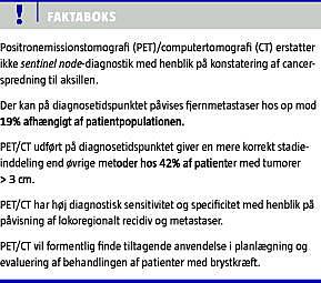 PET/CT er PET overlegen med hensyn til lokalisering og karakterisering af områder med patologisk FDG-optag og er bedre end CT alene til præoperativ stadieinddeling af brystkræft [3].