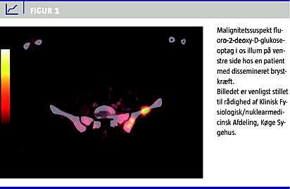 Skelettet er ligeledes hyppigt sæde for metastasering (Figur 1 ). I flere studier har man fundet, at PET er sammenlignelig med knogleskintigrafi, hvad angår sensitiviteten for påvisning af osteolytiske metastaser, men har en højere specificitet [12, 13]. På grund af et mindre FDG-optag i osteosklerotiske metastaser er sensitiviteten for påvisning af disse lavere med PET end med knogleskintigrafi [5, 14]. Med PET kan man i modsætning til med knogleskintigrafi påvise metastaser til knoglemarven. De to modaliteter synes således at kunne supplere hinanden i diagnostikken.