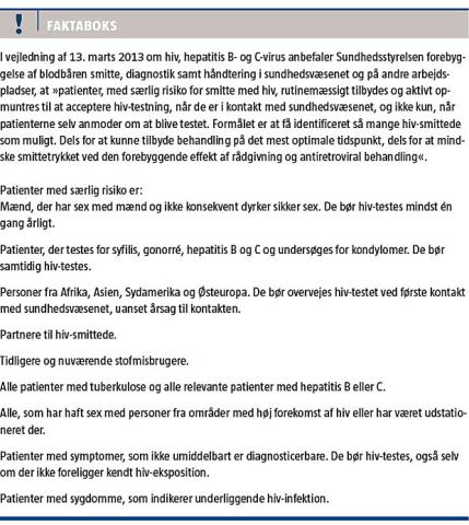 Dansk Selskab for Infektionsmedicin ønsker med denne artikel at øge opmærksomheden på de indikatortilstande, der på europæisk plan anvendes ved hiv-testning, og som vi også i Danmark bør implementere mere systematisk med henblik på tidlig diagnostik og behandling af hiv-infektion.