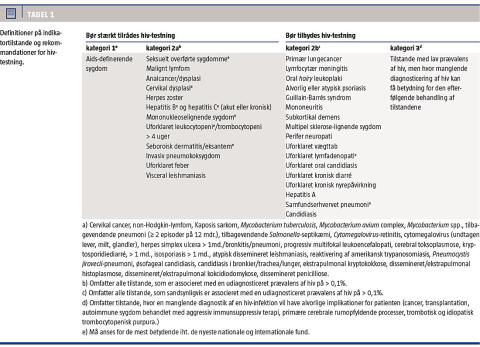 Kategori 1 omfatter aids-definerende sygdomme, der er af relevans i Danmark. Alle personer, der har en af disse, bør hiv-testes, uanset prævalensen af hiv-infektion i baggrundsbefolkningen. Prævalensen af hiv vil oftest være meget høj, men ved enkelte diagnoser ved man, at prævalensen i Danmark er relativt lav og måske ikke forskellig fra prævalensen i baggrundsbefolkningen [22, 29]. En aids-definerende sygdom opstår først på et tidspunkt, hvor immunforsvaret er alvorligt påvirket, og hvis hiv-infektionen forbliver udiagnosticeret, og den aids-definerende sygdom behandles, vil andre aids-definerende sygdomme hurtigt opstå. For at hindre yderligere progression af hiv-infektionen og øge overlevelsen er det essentielt at indlede antiretroviral behandling inden for kort tid efter diagnosticering.