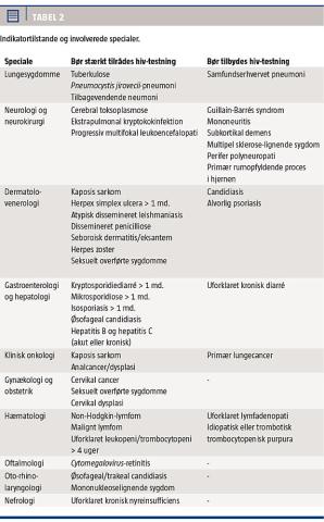 i almen praksis. Der er p.t. en undersøgelse i gang i Danmark af indikatorsygdomme for hiv i almen praksis. Indikatortilstandene vil hyppigt foranledige udredning og behandling fra flere forskellige specialer. Imidlertid kan man opstille de indikatortilstande, der mest sandsynligt vil involvere enkelte specialer (Tabel 2). Heri er ikke medtaget hverken almen medicin, hvor enhver af de oplistede indikatortilstande vil være relevante, eller infektionsmedicin, der naturligt vil kunne blive involveret i behandlingen og udredningen af de fleste indikatortilstande. Den store variation i indikatortilstandene er en betydelig udfordring for klinikerens opmærksomhed, således at han/hun kan bidrage til en øget hiv-testning.