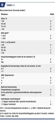 Sværhedsgraden af sygdommen har stor betydning for behandling og opfølgning [9]. Der findes to metoder til karakteristik af sværhedsgraden af bronkiektasisygdommen, BSI- og FACED-score [10-12]. En undersøgelse af 1.612 patienter [10] viste, at en højere BSI-score (Tabel 1) var associeret med flere indlæggelser, exacerbationer og respiratoriske symptomer samt dårligere livskvalitet og fald i lungefunktionen end en lavere BSI-score. Selvom der endnu ikke foreligger behandlingsalgoritmer, hvor man inddrager BSI-testen, bør den anvendes i den daglige klinik. Den kan være rådgivende for, hvor aggressiv behandlingsstrategien bør være, og hvilke patienter der bør følges på specialistniveau.