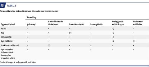 Basisbehandlingen ved bronkiektasi er lungefysioterapi, oftest også med positive expiratory pressure-fløjte eller continuous positive airway pressure-behandling (Figur 1 og Tabel 2). Lungerehabilitering har ved mange lungesygdomme vist effekt, og ved bronkiektasi bør det tilbydes ved kendt sameksisterende lungesygdom.