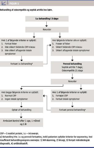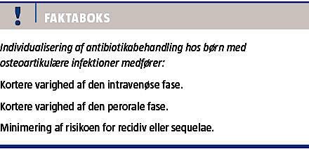 Sammenlignet med traditionel praksis kan behandlingsvarigheden ved osteoartikulære infektioner hos de fleste børn nedsættes betydeligt, og allerede på et tidligt tidspunkt kan der skiftes til peroral behandling. Det er dog vigtigt at gøre sig klart, at dette forudsætter en individualiseret behandlingsvarighed, som afhænger af det kliniske og parakliniske respons. Nogle børn kan således fortsat have brug for langvarig behandling. Desuden blev antibiotika i alle fire studier fordelt på fire daglige doser, og der blev i det britisk/australske studie anvendt meget høje doser. Komplians med disse doseringsregimer er formentlig afgørende for behandlingseffekten.