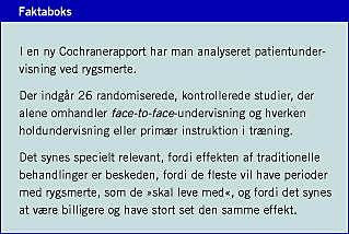 Samfundets udgifter til rygbehandling er enorme. I almindelighed er effekten af traditionelle behandlinger ret beskeden [1], og specielt synes behandlinger ikke at afkorte perioder med rygsmerter [2]. Selv om visse traditionelle behandlinger kan reducere ubehaget noget, bør der fokuseres på, at patienterne skal håndtere smerterne så fornuftigt som muligt. Videre bør man naturligvis vælge de billigste og mest risikofrie behandlinger, hvis forskellige behandlinger ellers er lige effektive. Af alle disse grunde kan patientuddannelse (PE) have et stort potentiale. Men hvor meget hjælper det egentlig?