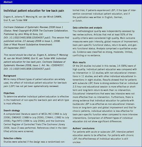 Det har længe været klart, at patientuddannelse/kognitive tiltag bør have mere fokus. Dette er bl.a. fremhævet i European Guidelines fra 2004 [1]. Det er også blevet tiltagende tydeligt, at opprioritering af kognitive indsatser kan ske på bekostning af en del af dagens traditionelle fysikalske behandlingsrutiner, hvis effekt generelt er beskeden. Men præcis hvor der skal skiftes strategi og i hvor stort omfang, kræver fortsatte undersøgelser. Denne Cochranerapport må kunne bidrage til en seriøs omlægning af dagens behandlingstiltag.
