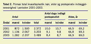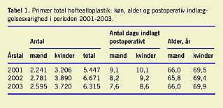 Resultater: I 2003 var kønsfordelingen for THA mænd:kvinder 1:1,4 og for TKA 1:1,7. Gennemsnitsalderen ved operation med THA var i 2003 66 år for mænd og 69,9 år for kvinder og ved operation med TKA 66,9 år for mænd og 69 år for kvinder. Den postoperative indlæggelsesvarighed var faldende i perioden for begge operationstyper og er i perioden reduceret med 16% for THA til gennemsnitligt 8,1 dage og med 17% for TKA til gennemsnitligt 8,6 dage i 2003. Den postoperative indlæggelsesvarighed var stigende med alder for både THA og TKA. Mænd havde kortere indlæggelsesvarighed end kvinder efter både THA og TKA.