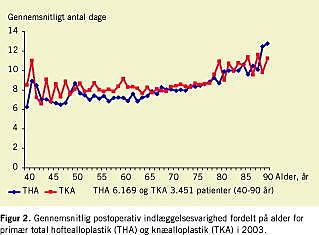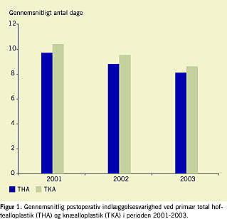 Den gennemsnitlige indlæggelsesvarighed efter operation med THA og TKA har været faldende i 2001-2003. I samme periode har kønsfordelingen og gennemsnitsalderen for de opererede patienter været uændret, hvorfor faldet i indlæggelsesvarighed må tilskrives ydre faktorer, herunder reduktion af det kirurgiske stressrespons, anvendelse af regional analgesi, optimeret smertebehandling, tidlig mobilisering m.m. Andre faktorer som planlægning af udskrivelsen, patientmotivation og et »brud med traditioner« har formentlig også spillet en rolle, ligesom det økonomiske incitament med indførelse af diagnoserelaterede grupper (DRG)-afregning kan have haft betydning, idet der i dette afregnes for udført indgreb uanset indlæggelsesvarighed.