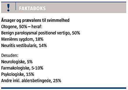 Op mod 10% af henvendelserne i almen praksis drejer sig om svimmelhed [1]. Halvdelen forårsages af en indre øre-lidelse [2]. Svimmelhed udgør et ikkeerkendt socioøkonomisk problem. I de seneste år har der været en betydelig udvikling inden for den vestibulære undersøgelsesteknik. Det betyder, at henvisning til veludstyrede svimmelhedscentre medfører en væsentlig forbedring af både diagnostik og behandling [3]. Konsekvensen af udviklingen er, at diagnostik og behandling af patienter med svimmelhed er blevet et ekspertområde. Vestibulogi er anført under otorhinolaryngologi i Sundhedsstyrelsens specialevejledning. De få centre i Danmark, hvor man råder over udstyr til moderne vestibulær diagnostik, er da også næsten alle otologiske (faktaboks).