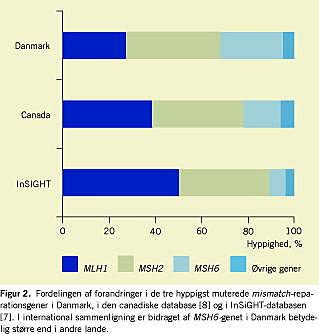 Identifikation af familiens mutation er vigtig og er grundlaget for tilbud om prædiktiv genetisk diagnostik. I 1993-1994 identificeredes den genetiske årsag til Lynch-syndrom i form af mutationer i MMR-generne MLH1, MSH2 og MSH6. I dag, 15 år efter de første påviste MMR-genmutationer, er der beskrevet omkring 600 unikke varianter i MLH1 og MSH2, og ca. 200 varianter i MSH6. Mutationer og varianter af ukendt betydning er tilgængelige på internettet via the International Society of Hereditary Gastrointestinal Cancer (InSiGHT) og via en canadisk database. Det danske HNPCC-register giver en unik mulighed for at kortlægge bidraget af de forskellige gener, og i dag er 138 MMR-genvarianter påvist, hvor 49% er fundet i MSH2-, 29% i MLH1- og 22% i MSH6- genet (Figur 2 ). Det danske mutationsspektrum adskiller sig fra de internationale rapporter med en lavere andel mutationer i MLH1 og en større betydning af MSH6- genet [7, 8]. Mutationer i MSH6- genet er rapporteret som værende koblet til en lavere risiko for kolorektal cancer, en høj risiko for gynækologisk cancer og en højere diagnosealder, men disse data er baseret på små kohorter og de danske MSH6- familier kan i denne sammenhæng bidrage med ny viden om cancerrisiko og tumorspektrum. Blandt de genetiske forandringer der er påvist, betegnes 88 mutationer i 164 danske familier som sygdomsassocierede. Selv om langt de fleste (78%) af disse mutationer er unikke og kun forekommer i en enkelt familie, bærer over halvdelen af familierne med mutation i MLH1- eller MSH2- genet en mutation, der er beskrevet i Lynch-syndrom-familier fra andre lande. Det indicerer, at et mindre antal mutationer sandsynligvis er årsag til sygdommen i en stor del af familierne. Denne viden kan bruges til videreudvikling af et testpanel i de tilfælde, hvor fuld mutationsanalyse ikke er mulig, f.eks. hvis der kun er adgang til paraffinindstøbt væv.