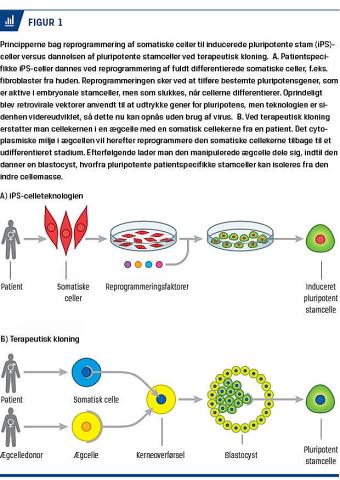 Før introduktionen af iPS-cellen var det kun muligt at danne pluripotente patientspecifikke stamceller ved brug af terapeutisk kloning. Her erstatter man cellekernen i en ægcelle med en somatisk cellekerne fra en patient. Det cytoplasmiske miljø i ægcellen vil herefter reprogrammere den somatiske cellekerne tilbage til et udifferentieret stadium. Efterfølgende lader man den manipulerede ægcelle dele sig, indtil den danner en blastocyst, hvorfra pluripotente patientspecifikke stamceller kan isoleres fra den indre cellemasse (Figur 1). Det at tilvirke humane embryoner ved kernetransplantation er kompliceret og begrænses desuden af behovet for egnede ægceller fra mennesker. Endvidere er der etiske problemer knyttet til brugen af klonede fosteranlæg, hvilket gør iPS-celleteknologien væsentligt mere attraktiv end den terapeutiske kloning [10].