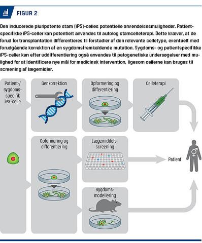 IPS-cellernes anvendelsesmuligheder og perspektiver er mange (Figur 2) og udvikles til stadighed. Der introduceres løbende bedre differentieringsprotokoller og nye teknikker til manipulation af de genererede iPS-celler. Muligheden for at danne såkaldte isogene celler, iPS-cellelinjer, som er genetisk identiske på nær specifikke sygdomsrelevante mutationer, har gjort iPS-cellernes potentiale inden for sygdomsmodellering endnu større. Isogene iPS-cellelinjer kan dannes ved enten at inducere en mutation i en oprindeligt rask iPS-cellelinje eller ved at rette en mutation i en patientderiveret iPS-cellelinje. Nyere og nu etablerede redskaber til udførelse af sådanne genetiske modifikationer er såkaldte zinc-finger nucleases, transcription-activator-like effector nucleases og clustered regularly interspaced short palindromic repeats-Cas9 [11]. Metoderne muliggør selektive undersøgelser af effekten af en mutation i ét specifikt gen som f.eks. PARK2, der kan være muteret ved familiær Parkinsons sygdom [12], og som vi på Syddansk Universitet i øjeblikket har meget stort fokus på.